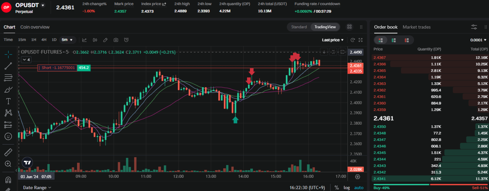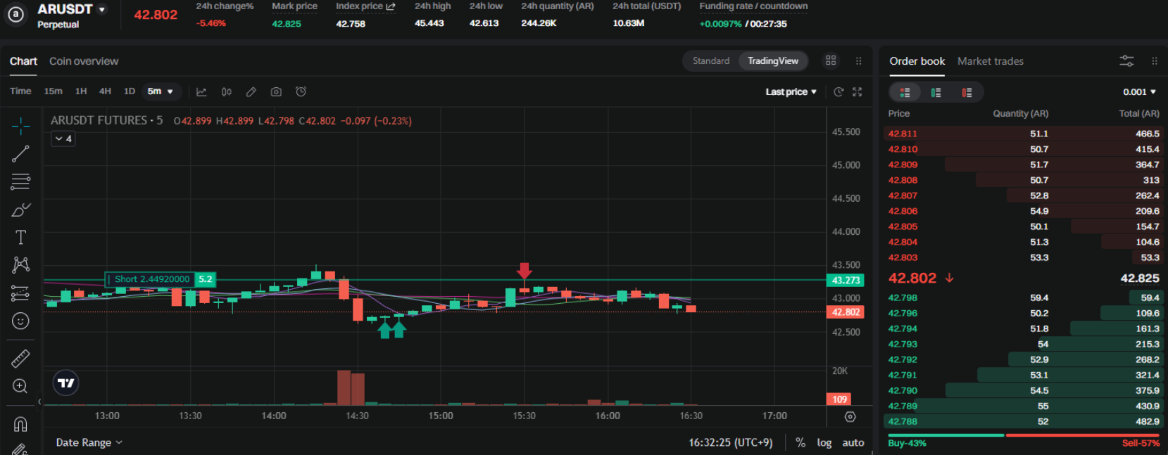 ↑왼쪽 OPUSDT 숏 진입후 추가매수로 평단 낮추는모습 ↑오른쪽 ARUSDT 횡보로 인하여 진입이 다소 소심한모습