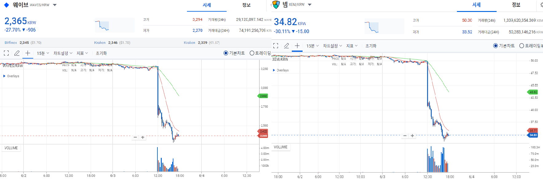 오늘 6/3 거래소 바이낸스에서 웨이브와 넴 종목이 상장 폐지되어