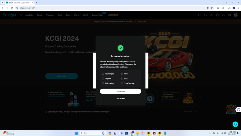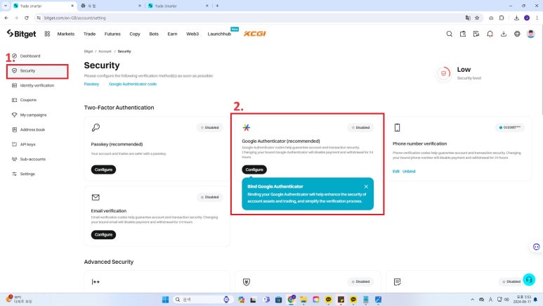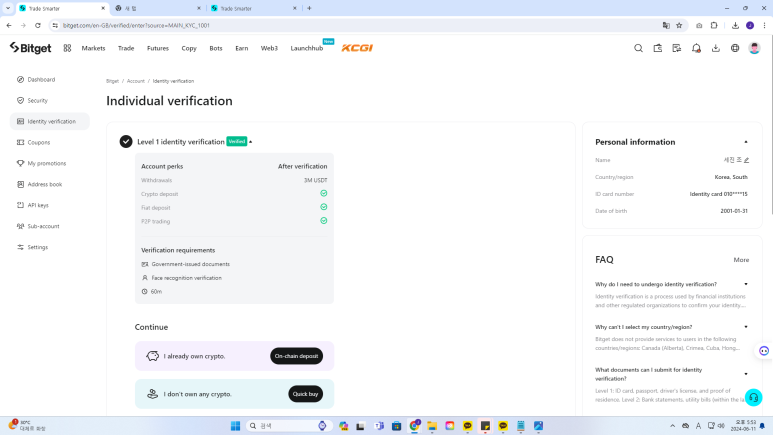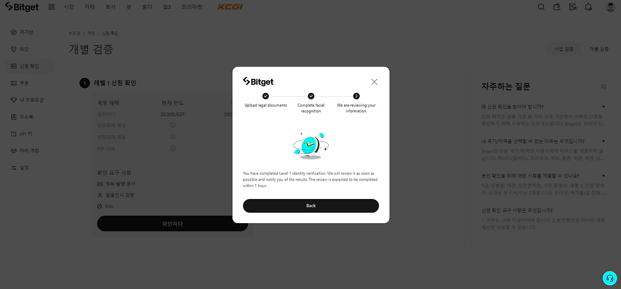 이렇게 비트겟 가입과 사용을 위한 인증이 모두 끝났습니다.