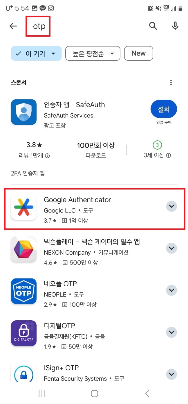 검색창에 [otp] 검색, Google authenticator 선택.