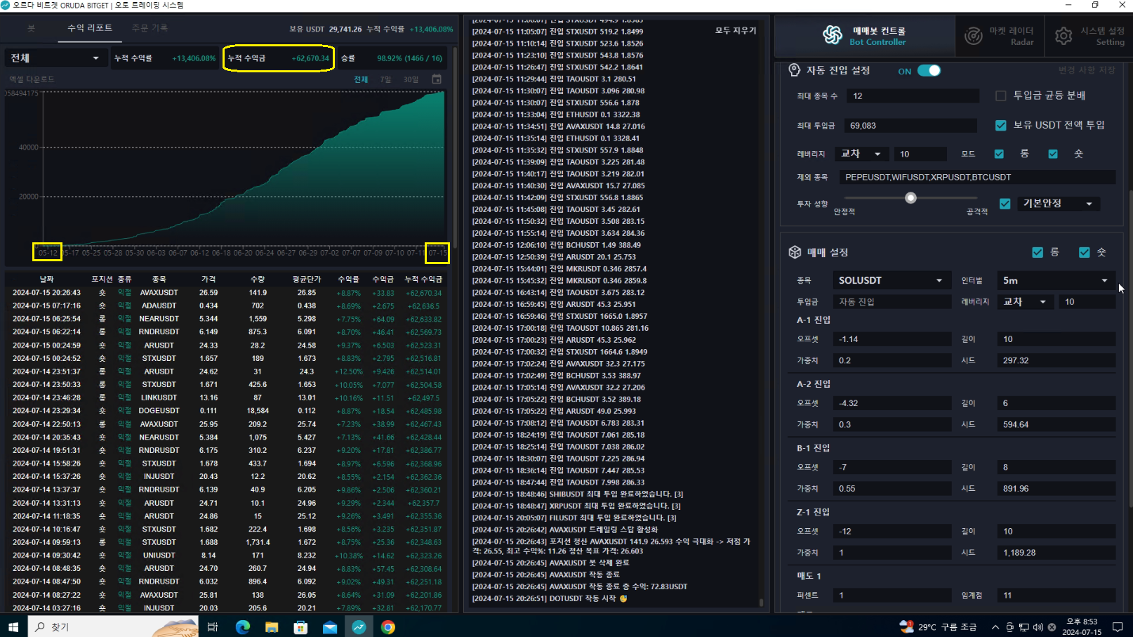 저번 하락이 크게 있던 것들이 전부 크게 익절하고 돌아온 덕분에 수익이 크게 늘어난 상황