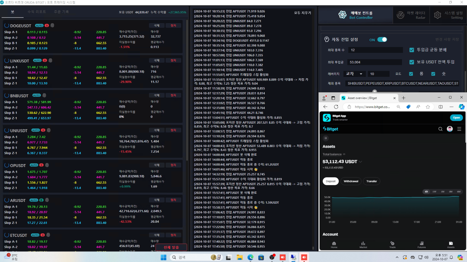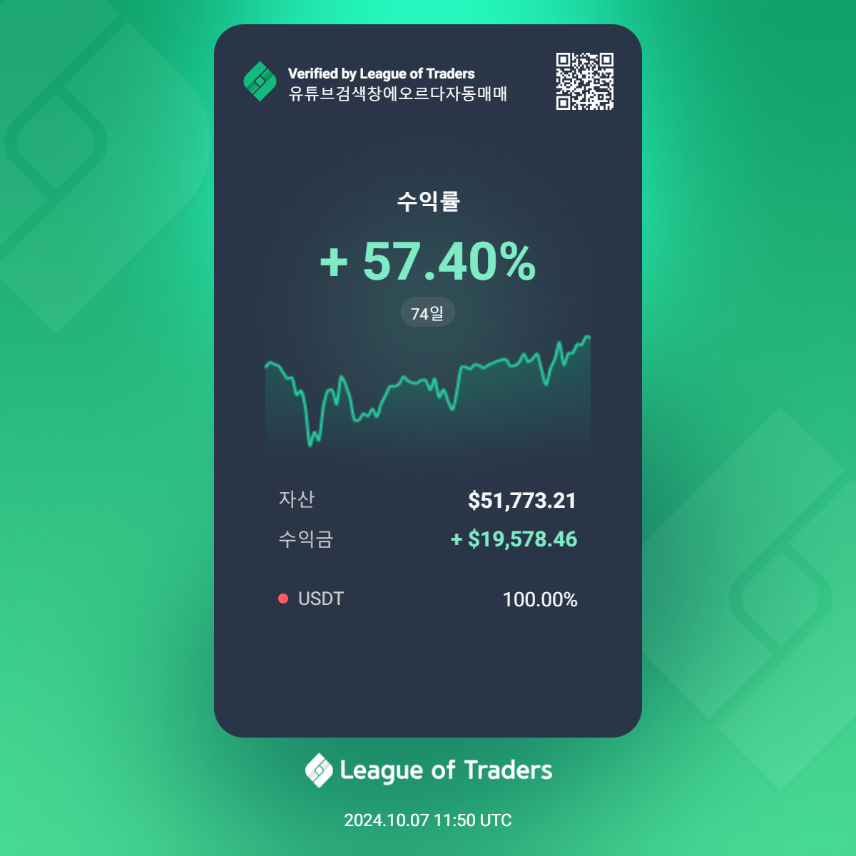 현재 금액 53,004USDT ( 중간 시드 투입으로 리그오브 트레이더스의 수익률의 차이가 있습니다 )
