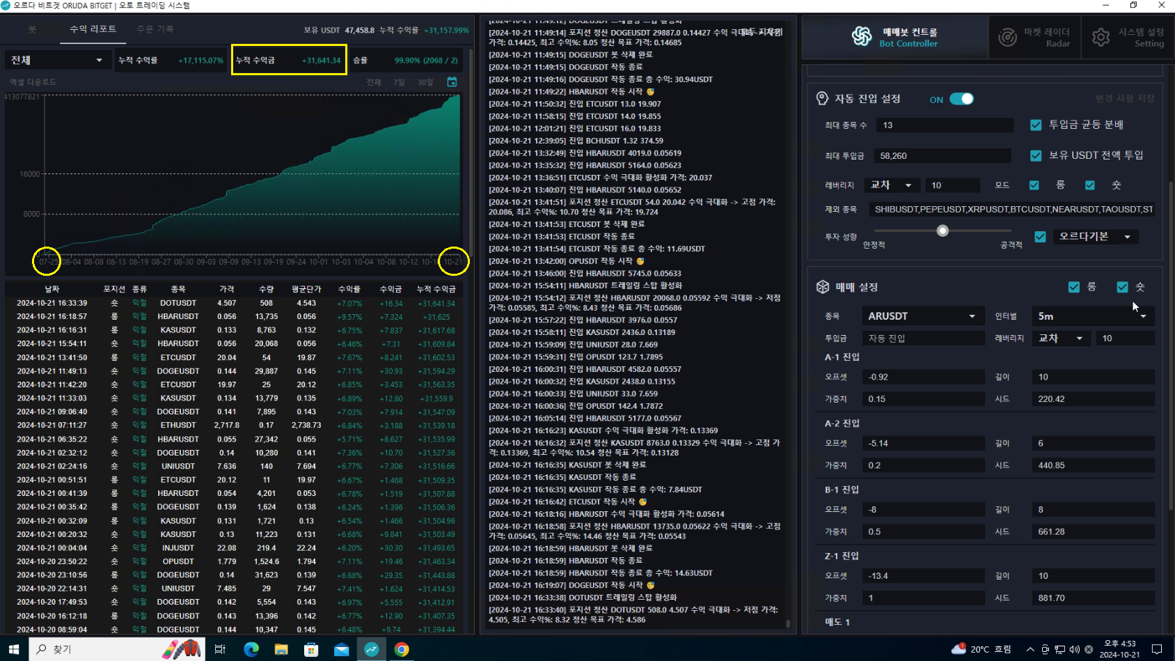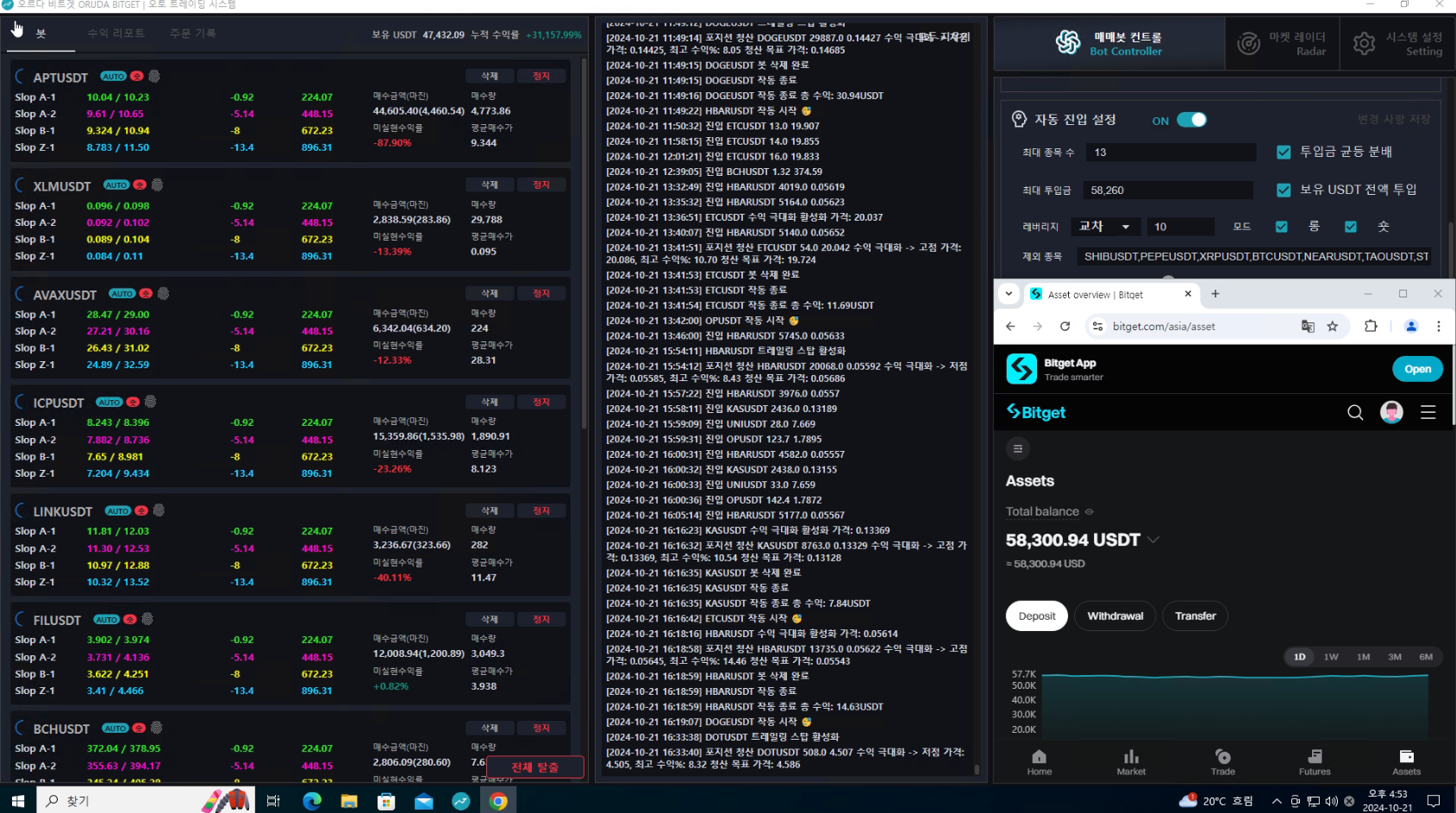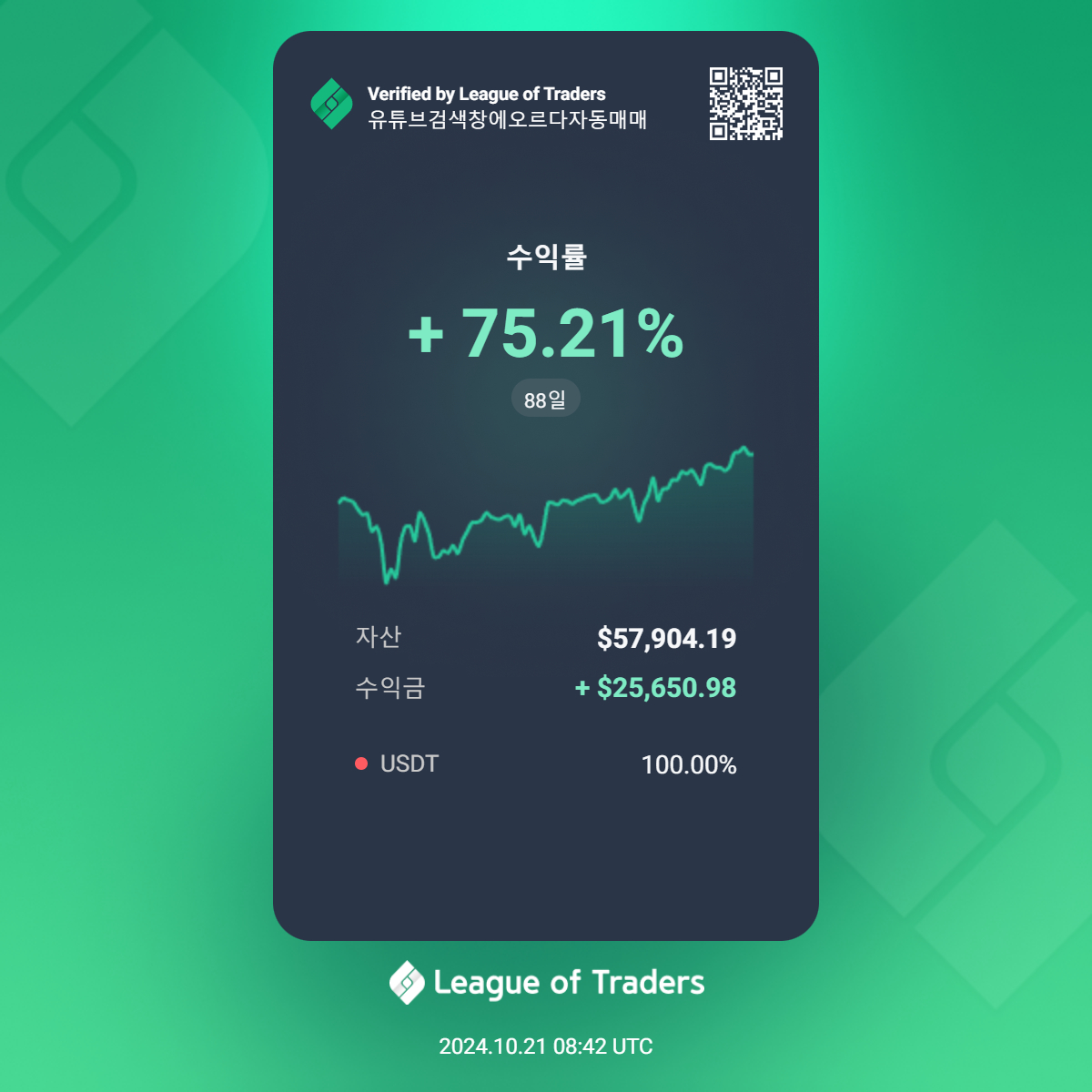현재 금액 58,2602USDT ( 중간 시드 투입으로 리그오브 트레이더스의 수익률의 차이가 있습니다 )