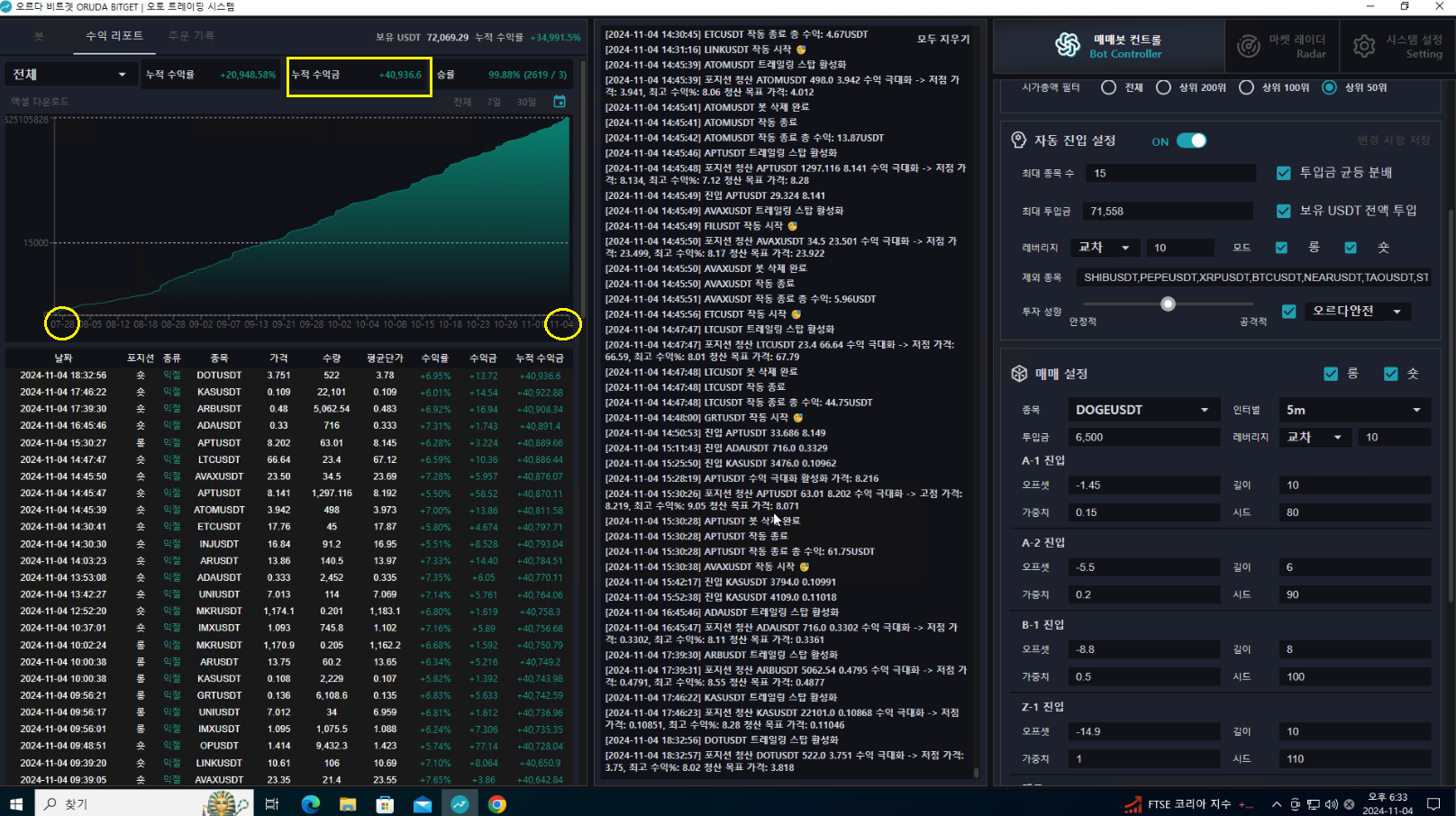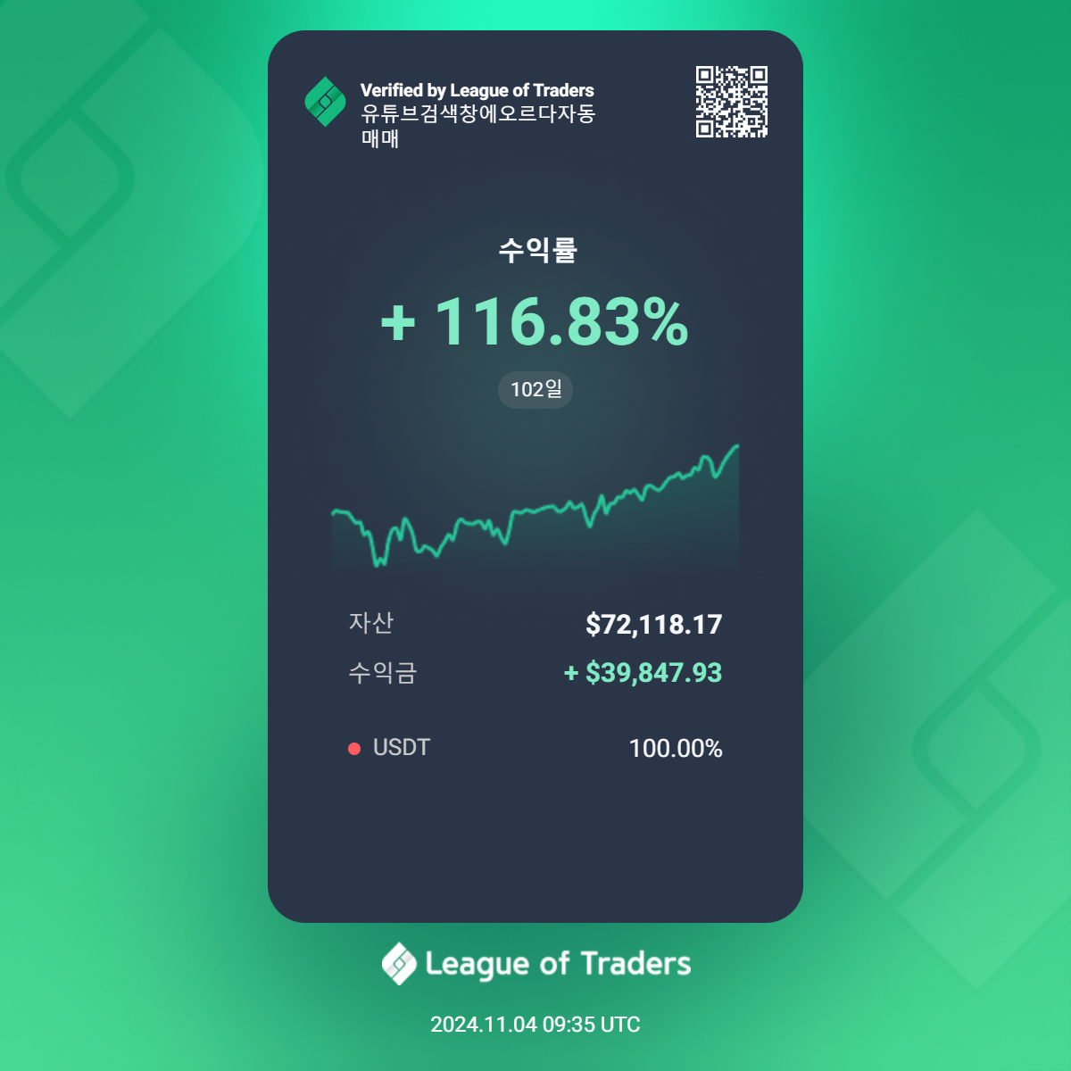 수익률 +334.88% ( 중간 시드 투입으로 리그오브 트레이더스의 수익률의 차이가 있습니다 )