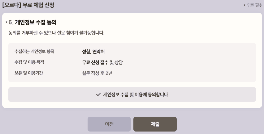 개인정보 수집 동의에 대해, 동의를 체크 후
